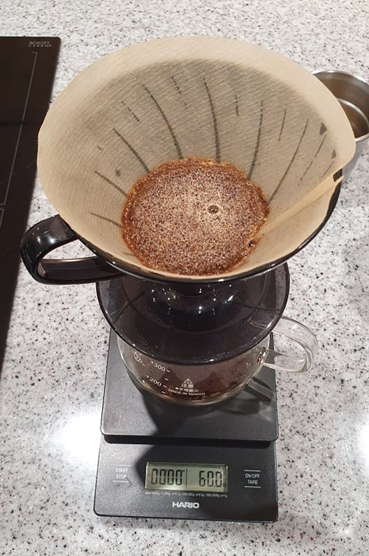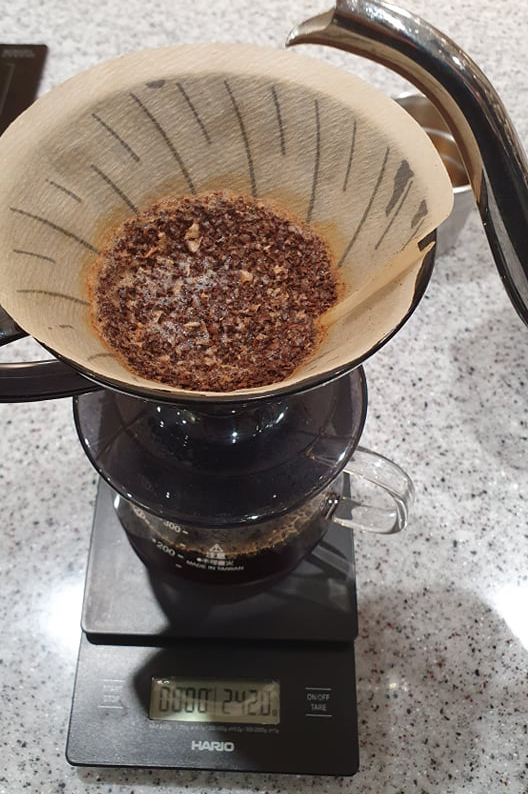 Step 2. 沖洗濾紙/第一段注水(注水兩次,共120ml)–46法的"4″,決定酸與甜。