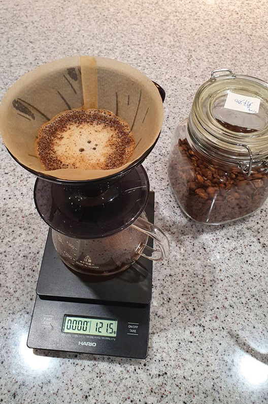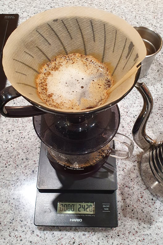 這裡有個小細節可以注意一下:雖然僅使用20g的咖啡,但粕谷哲先生選擇的濾杯是V60的02濾杯(大的,1-4人用)。 一般20G其實使用小的濾杯就夠用了,這裡使用大號濾杯,最主要的差別是,這可以讓你的水柱高度離咖啡粉比較遠--藉此加強水的衝力,提高萃取效率(因為是粗研磨,萃取效率偏低)所以,如果你家是小的濾杯,請記得把水柱的高度提高一些。