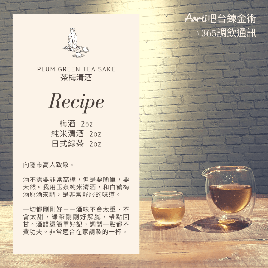 一切都剛剛好--酒味不會太重、不會太甜,綠茶剛剛好解膩,帶點回甘。酒譜還簡單好記,調製一點都不費功夫。你們在家也可以試試看。