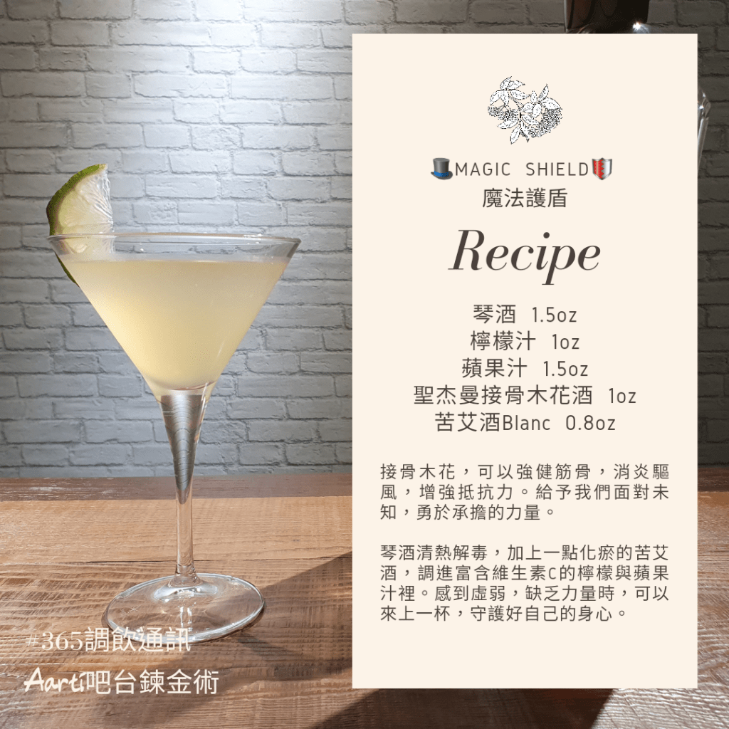 琴酒清熱解毒,加上一點化瘀的苦艾酒,調進富含維生素C的檸檬與蘋果汁裡。感到虛弱,缺乏力量時,可以來上一杯,守護好自己的身心。