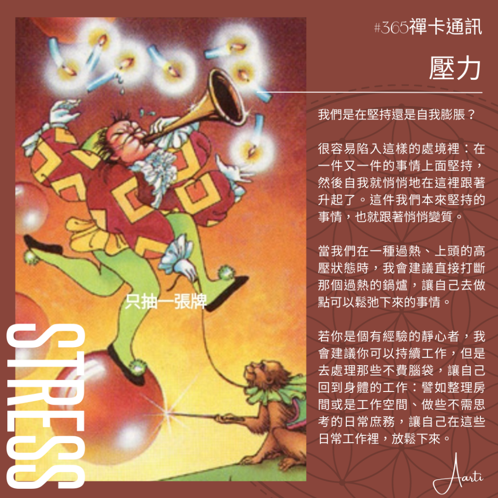 若你是個有經驗的靜心者,我會建議你,可以持續工作,但是去處理那些些不費腦袋,讓自己可以回到身體的工作:譬如整理房間或是工作空間、做些不需思考的日常庶務,讓自己在這些日常工作裡,放鬆下來。