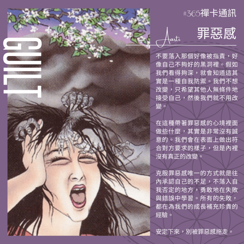 克服罪惡感唯一的方式就是往內承認自己的不足,不落入自我否定的地方,勇敢地在失敗與錯誤中學習。所有的失敗,都在為我們的成長補充珍貴的經驗。