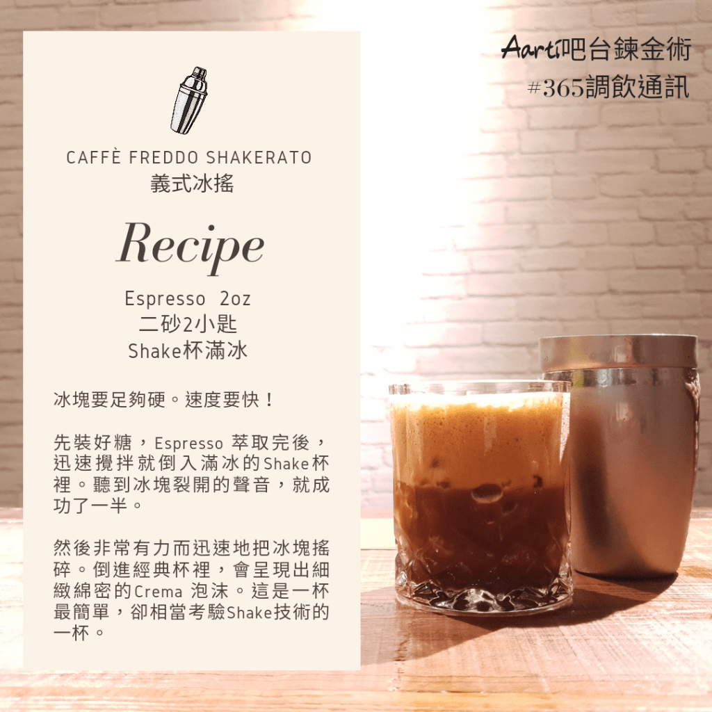 先裝好糖,Espresso 萃取完後,迅速攪拌就倒入滿冰的Shake杯裡。聽到冰塊裂開的聲音,就成功了一半。