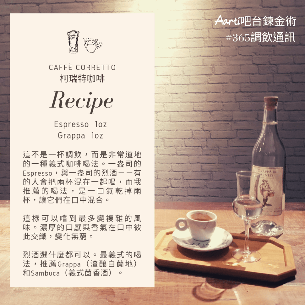 這不是一杯調飲,而是非常道地的一種義式咖啡喝法。一盎司的Espresso,與一盎司的烈酒--有的人會把兩杯混在一起喝,而我推薦的喝法,是一口氣乾掉兩杯,讓它們在口中混合。