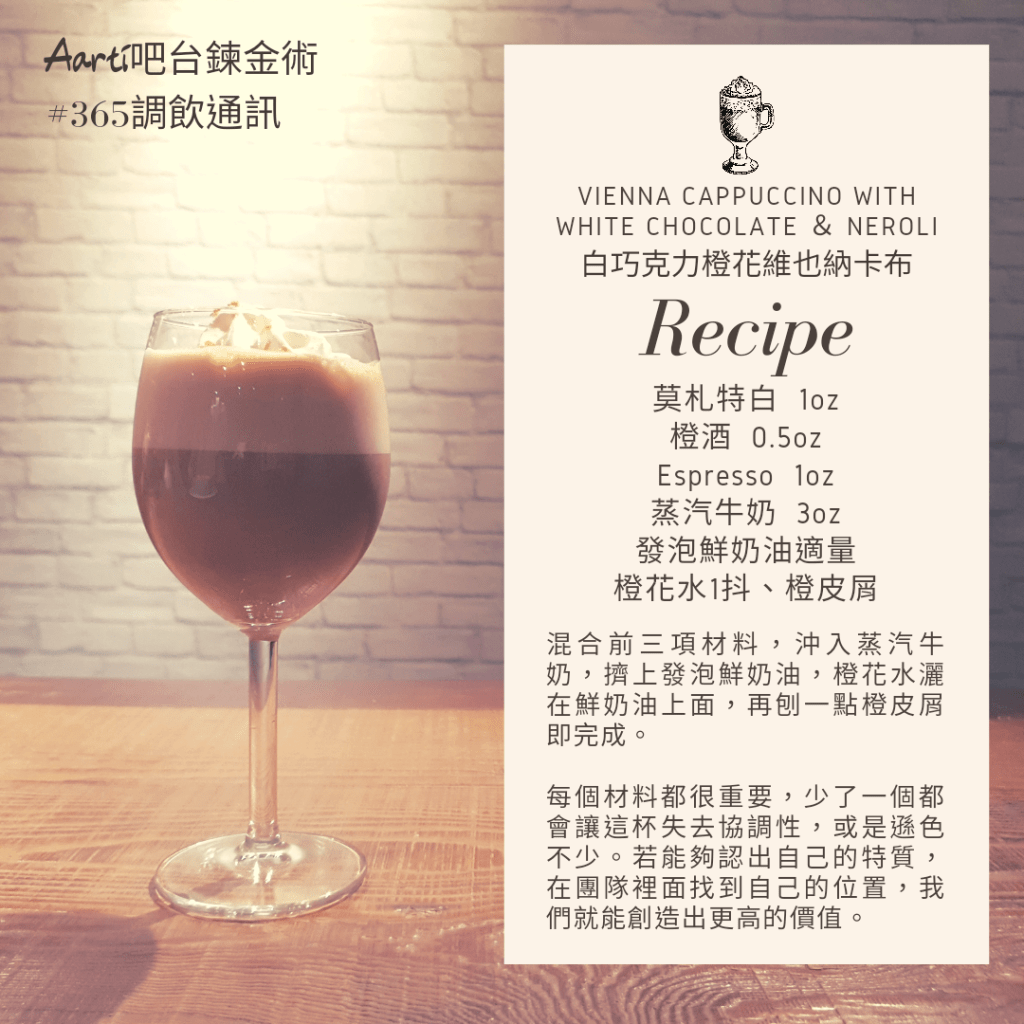 混合前三項材料,沖入蒸汽牛奶,擠上發泡鮮奶油,橙花水灑在鮮奶油上面,再刨一點橙皮屑即完成。
