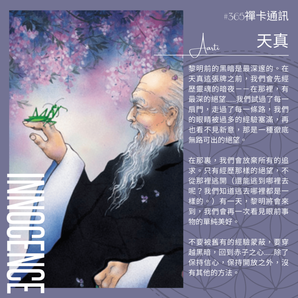 黎明前的黑暗是最深邃的。在天真這張牌之前,我們會先經歷靈魂的暗夜--在那裡,有最深的絕望……我們試過了每一扇門,走過了每一條路,我們的眼睛被過多的經驗塞滿,再也看不見新意,那是一種徹底無路可出的絕望。