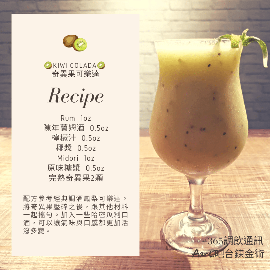 配方參考經典調酒鳳梨可樂達。將奇異果壓碎之後,跟其他材料一起搖勻。加入一些哈密瓜利口酒,可以讓氣味與口感都更加活潑多變。