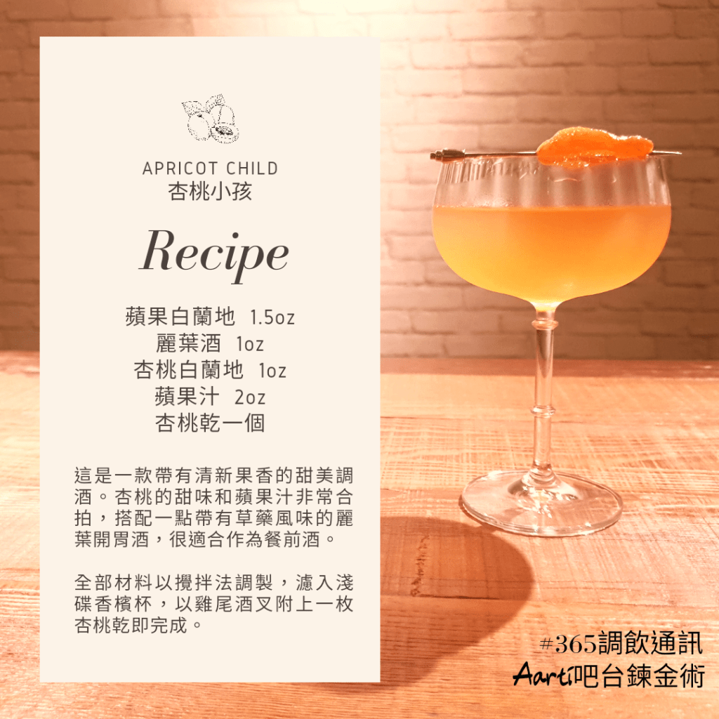 這是一款帶有清新果香的甜美調酒。杏桃的甜味和蘋果汁非常合拍,搭配一點帶有草藥風味的麗葉開胃酒,很適合作為餐前酒。