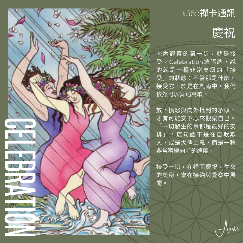向內觀察的第一步,就是接受。Celebration這張牌,說的就是一種非常高級的「接受」的狀態:不管那是什麼,接受它。於是在風雨中,我們依然可以舞蹈高歌。