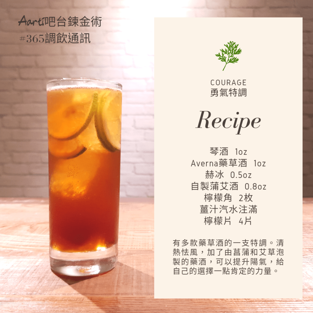 有多款藥草酒的一支特調。清熱怯風,加了由菖蒲和艾草泡製的藥酒,可以提升陽氣,給自己的選擇一點肯定的力量。