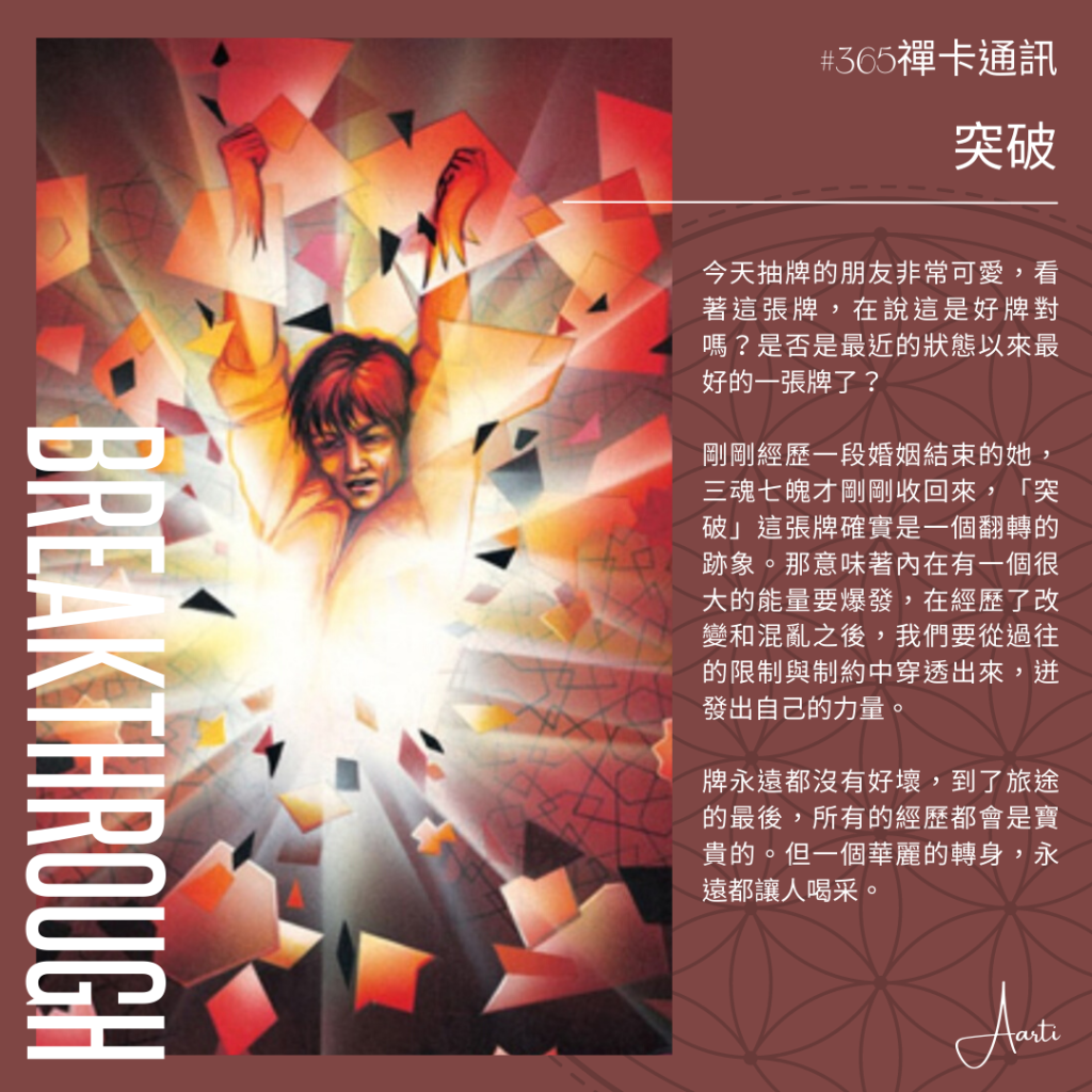 剛剛經歷一段婚姻結束的她,三魂七魄才剛剛收回來,「突破」這張牌確實是一個翻轉的跡象。那意味著內在有一個很大的能量要爆發,在經歷了改變和混亂之後,我們要從過往的限制與制約中穿透出來,迸發出自己的力量。