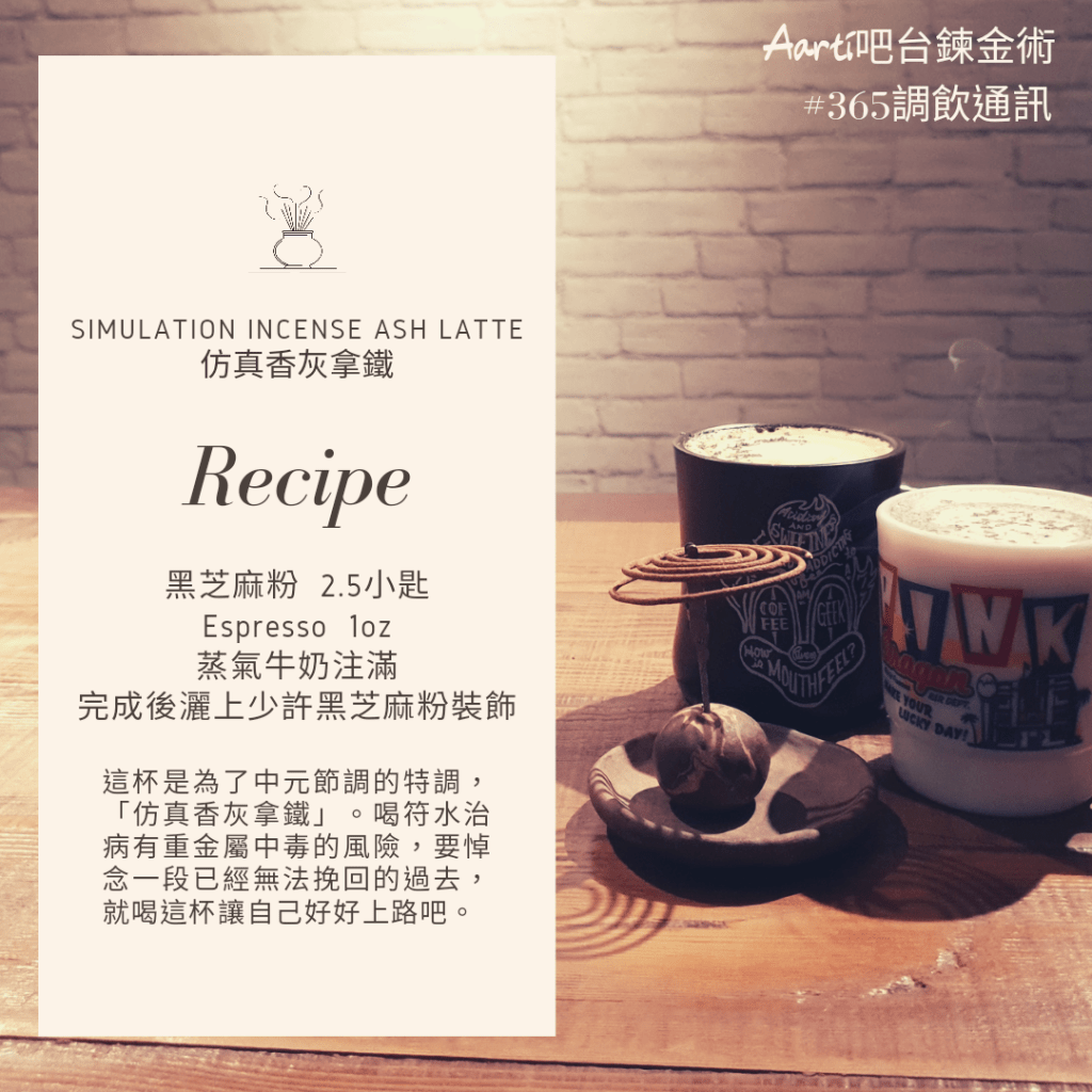 這杯是為了中元節調的特調,「仿真香灰拿鐵」。喝符水治病有重金屬中毒的風險,要悼念一段已經無法挽回的過去,就喝這杯讓自己好好上路吧。