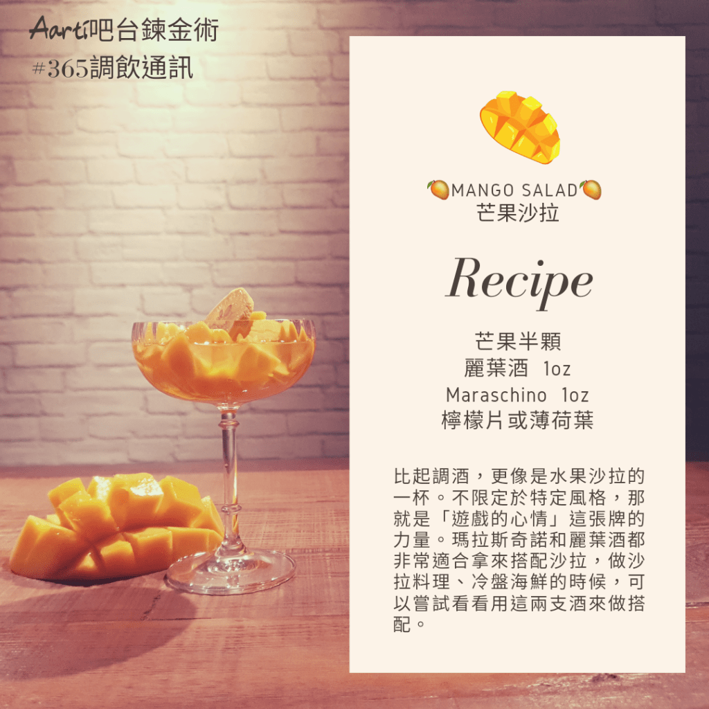 比起調酒,更像是水果沙拉的一杯。不限定於特定風格,那就是「遊戲的心情」這張牌的力量。瑪拉斯奇諾和麗葉酒都非常適合拿來搭配沙拉,做沙拉料理、冷盤海鮮的時候,可以嘗試看看用這兩支酒來做搭配。