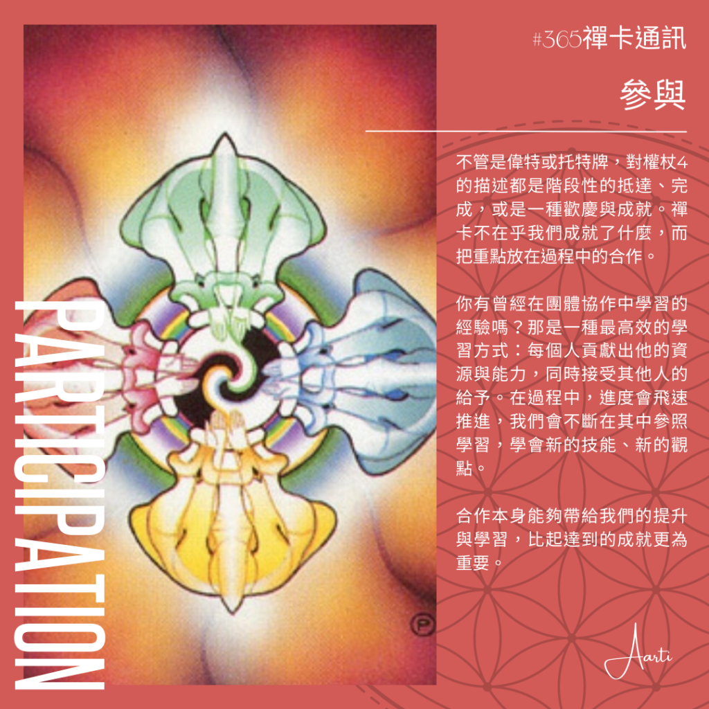 不管是偉特或托特牌,對權杖4的描述都是階段性的抵達、完成,或是一種歡慶與成就。禪卡不在乎我們成就了什麼,而把重點放在過程中的合作。