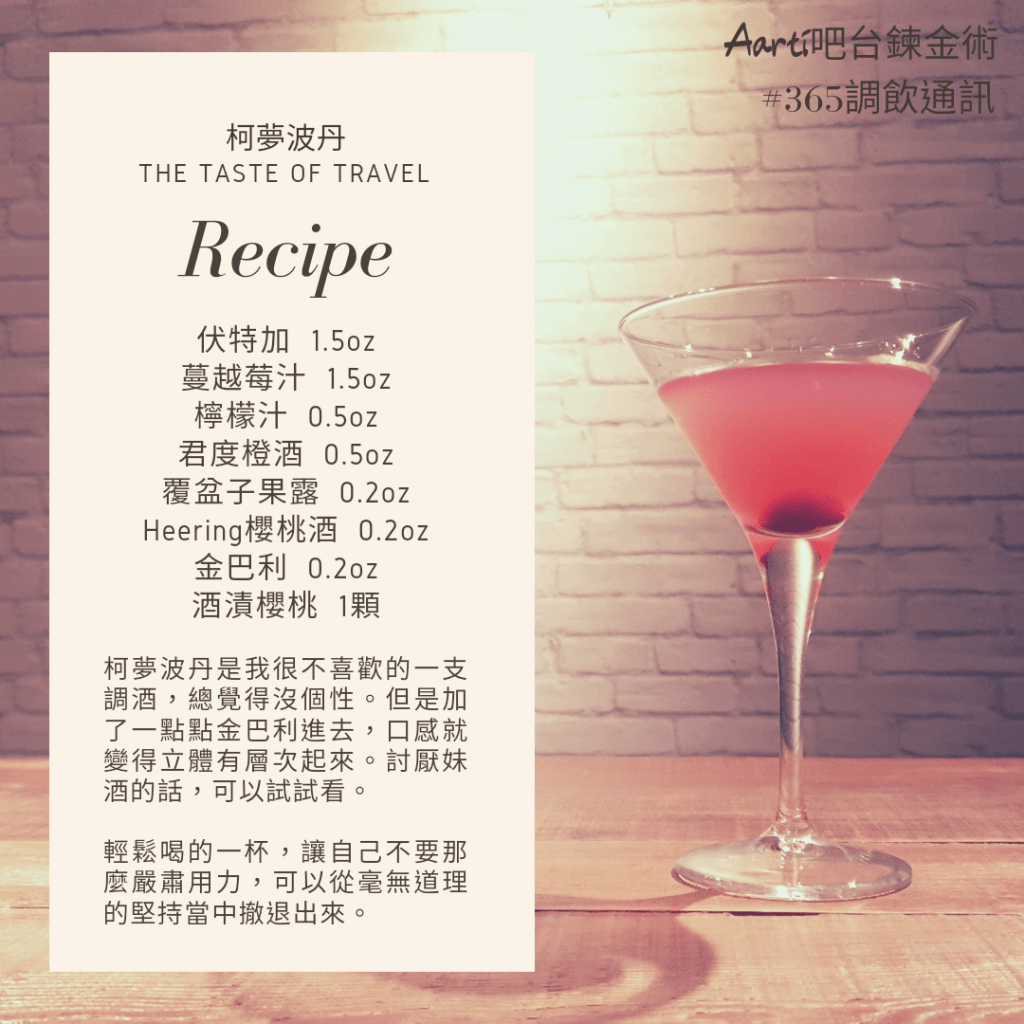 柯夢波丹是我很不喜歡的一支調酒,總覺得沒個性。但是加了一點點金巴利進去,口感就變得立體有層次起來。討厭妹酒的話,可以試試看。