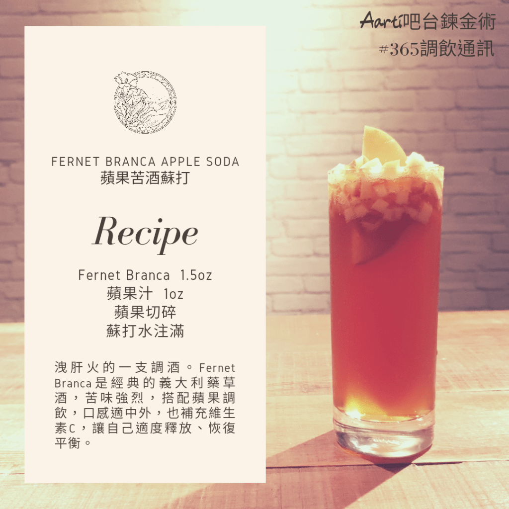 洩肝火的一支調酒。Fernet Branca是經典的義大利藥草酒,苦味強烈,搭配蘋果調飲,口感適中外,也補充維生素C,讓自己適度釋放、恢復平衡。
