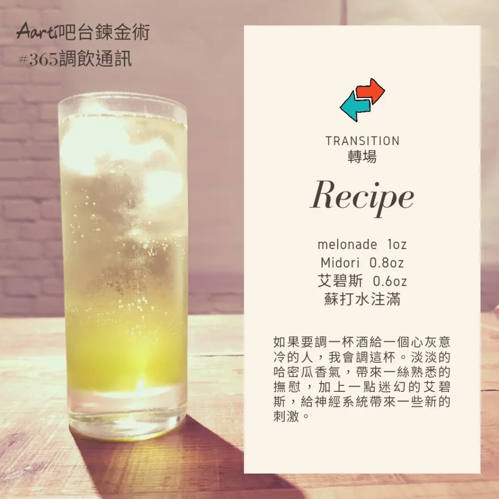 如果要調一杯酒給一個心灰意冷的人,我會調這杯。淡淡的哈密瓜香氣,帶來一絲熟悉的撫慰,加上一點迷幻的艾碧斯,給神經系統帶來一些新的刺激。
