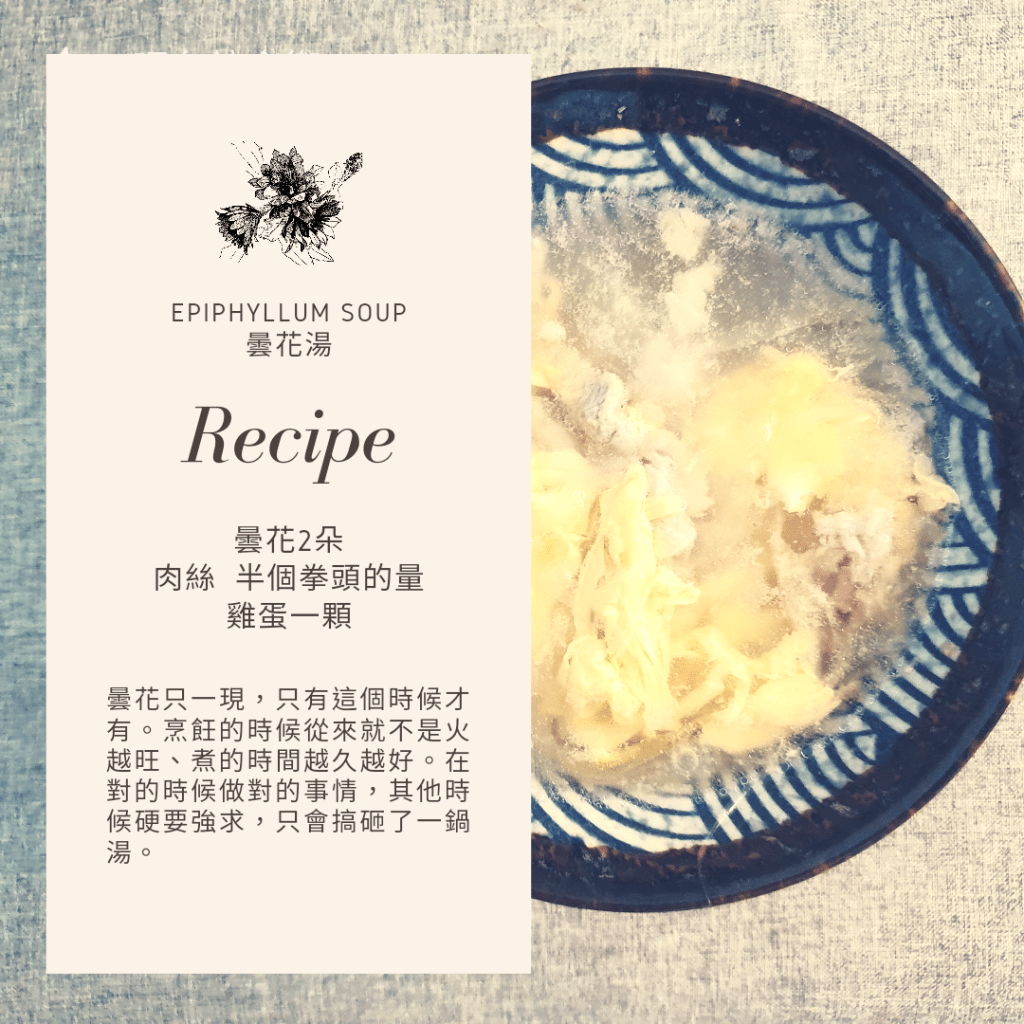 正好是曇花的時節,今天喝曇花湯。有時間的話可以先熬個排骨湯頭,簡便一點的話,就下面食譜的材料也可以。滾水下肉絲,把撕碎的曇花丟進去(整朵都可以吃),再打個蛋花就完成了。